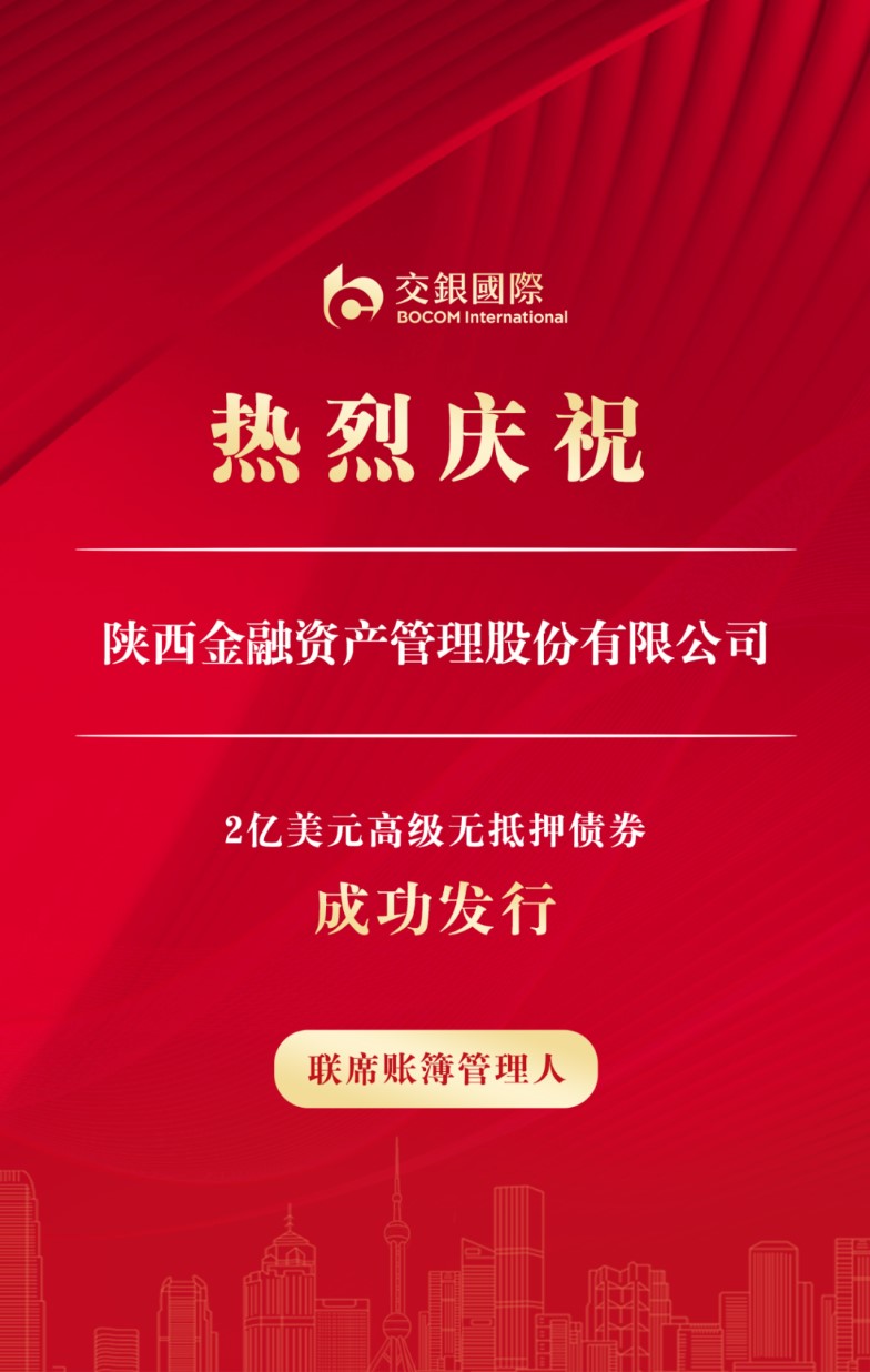 2月29日,交銀國際作為聯席帳簿管理人助力陝西金融資產管理股份有限公司(“陝西金資”)成功發行3年期2億美元高級無抵押債券,票面利率5.8%。在聯合承銷團的建議下,陝西金資以初始價格指導6.5%區間向市場打開簿記,交銀國際與交通銀行陝西省分行聯動,落實內部訂單,在堅實的基石訂單支援下,最終發行收益率6%,較初始價格指導大幅收窄50個基點。 陝西金資作為陝西省首家也是唯一一家擁有批量收購和處置不良金融資產資質的省級國有資產管理公司,承擔著管理化解地方金融風險、支持國企去杠杆及推動當地經濟發展的重要作用。該筆債券是交銀國際繼2021年協助公司發行美元債以來,第二次參與其境外債發行工作,有效拓寬了公司境外融資渠道,雙方銀企關係進一步深化。 |